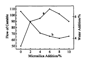 圖7 硅微粉加入量與澆注料流動(dòng)性(a)及加水量(b)的關(guān)系