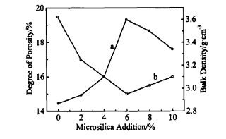 圖8 硅微粉加入量與澆注料氣孔率(a)及體積密度(b)的關(guān)系