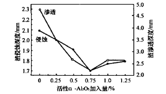 圖5示出了澆注料的抗渣性能與活性α—Al2O3添加量的關系。可以看出,隨著配料中活性α—Al2O3添加量的增加,澆注料的侵蝕深度與滲透深度在開始階段不斷下降,但當活性α—Al2O3加入量超過一定量后,澆注料的抗渣性與上面分析的強度相一致,與組織結構密切相關。澆注料的機構越致密,結構缺陷減少,則其抗渣性能也越好。