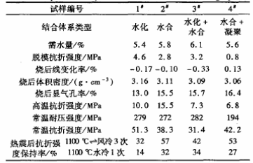比較發現,在這4種不同結合體系的試樣中,采用水化結合體系的1#試樣的需水量相對較低,燒后顯氣孔率低,脫模強度和燒后常溫及高溫強度較高;而采用水合結合體系的2#試樣的高溫強度和抗熱震性明顯優于其他試樣,但其脫模強度較低。綜合考慮,選擇水化結合作為本研究的結合體系。