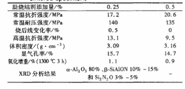 氮化燒成后試樣按相應標準測試各種物理性能,其中高溫抗折強度測試條件為1400℃保溫0.5h。