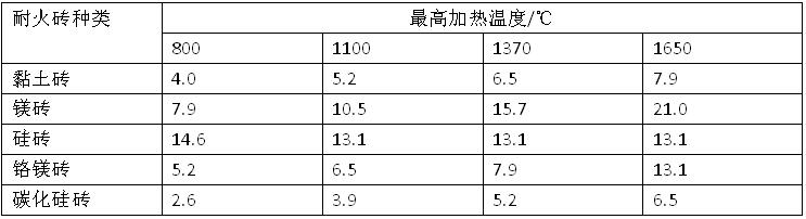 在耐火磚砌體結構中膨脹縫的留設主要有直線形、折線形和端部集中留設等形式。一般來講,對于相對移動量小、爐膛溫度和爐壓不高的耐火磚墻體,多采用直線形膨脹縫。否則,宜用折線形膨脹縫。對于一些結構尺寸和爐膛跨度較小,總計算膨脹量不大的耐火磚墻體,也可采用端部幾種留設膨脹縫的結構。以下是幾種耐火磚的每米膨脹縫設計尺寸(mm)。