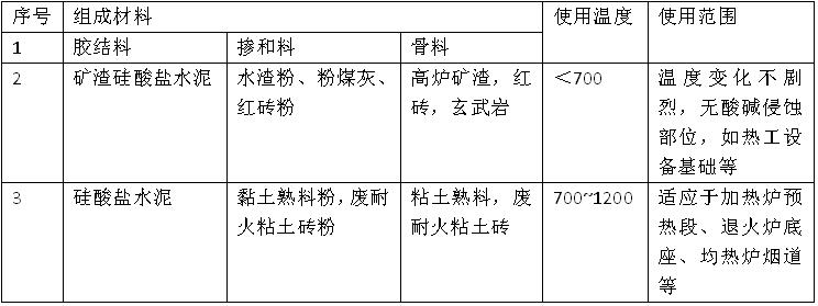硅酸鹽水泥結合耐火澆注料是以普通硅酸鹽水泥、礦渣硅酸鹽水泥和硅酸鹽耐熱水泥等為膠結料、與耐火骨料、粉料配制而成。其使用溫度為700~1200℃,可用于整體承重耐熱結構的窯爐內襯,特別是在熱工設備基礎和底板煙道、煙囪內襯以及熱儲礦槽等工程中用應用較多。其指標見下表