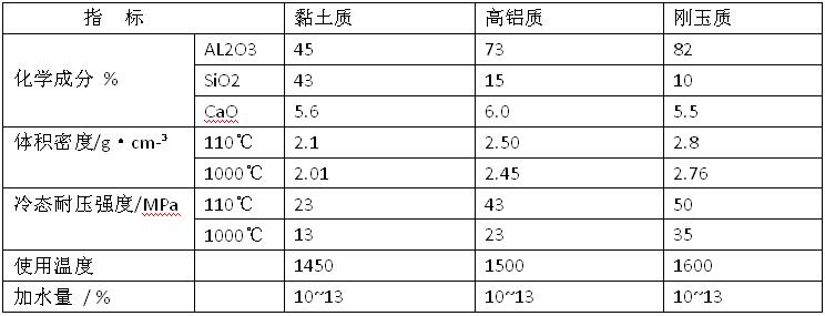 按膠結劑種類不同可分為礬土水泥耐火澆注料、鋁-60水泥耐火澆注料、低鈣鋁酸鹽水泥澆注料和純鋁酸鈣水泥耐火澆注料等、鋁酸鹽水泥耐火澆注料具有快硬高強、熱震穩定性好、耐火度高等特點,因此廣泛應用于冶金、石油化工、水電、建材和機械等工業部門的一般工業窯爐和熱工設備上,其最高使用溫度為1400~1600℃,有的可達1800℃左右。普通鋁酸鹽水泥結合耐火澆注料常用的膠結劑就是礬土水泥、鋁-60水泥、低鈣鋁酸鹽水泥。礬土水泥的主要礦物鋁酸一鈣。因此,礬土水泥配制的耐火澆注料具有快硬高強的特點。為了改善其性能,可選用優質耐火骨料和粉料,也可采用加入微粉來降低水泥用量,調整顆粒級配等措施。礬土水泥結合黏土質、高鋁質、剛玉質澆注料的理化指標見下表