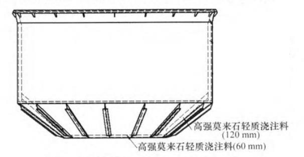 在過去的施工案例中,使用自主生產的高強莫來石輕質澆注料作為焦罐的內襯材料。其良好的體積密度、耐磨性以及較高的耐壓強度、抗折強度性能能有效滿足紅焦對焦罐內襯的要求。在應用中,采用錨固釘保證澆注料的穩定性,施工后通過自然養護和烘干后即可投入生產。