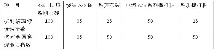 電熔AZS搗打料生產(chǎn)的關鍵是用原磚分所制得,內(nèi)含月205玻璃相。電熔AZS系列搗打料玻璃相的存在使其在超過800℃后變成應變材料,在800~1300℃溫度范圍內(nèi)材料的可塑性和粘附性有利于接縫在某些微弱位移的情況下保持密封,并使其與其含同樣玻璃相的電熔鋯剛玉磚鋪面磚之間形成可靠的中間隔層。能有效地防止發(fā)泡玻璃液滲入鋪面磚和襯層之間,避免“向上鉆孔”侵蝕,使池底壽命得以延長。下表為電熔AZS系類搗打料理化指標