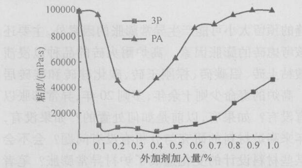 低水泥耐火澆注料在生產時需添加適量的輔助原料以改變成品的性能,減水劑是其中的一類選用減水劑三聚磷酸鈉 (3P)和氨基磺酸鹽系 (PA)。做成品的實驗,試驗原料的配比如下 :高鋁礬土粉 53% ,水泥 (CA - 70 ) 13% ,硅灰 7% ,α-AL2O3微粉10% ,石英粉 7% ,廣西粘土 10%。將配好的料充分混合均勻制成干混料 ,然后稱取 1 kg混合料 ,分別加入不同量的減水劑 3P和 PA,再加水 (加水量為干粉質量的30% )攪拌3 m in后 ,成為高濃度的懸浮漿體,立即測量此漿體的粘度。