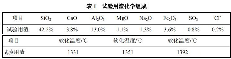 本試驗所涉及的垃圾熔融爐,其工作溫度≥1300 ℃,采用電加熱工藝,爐內(nèi)氣氛為氧化氣氛,進(jìn)出料方式為連續(xù)出料,從試驗用渣的化學(xué)組成可以得到,w(CaO)/w(SiO2)的比值小,熔渣呈酸性。