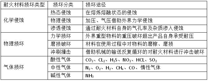 耐火磚的工作環(huán)境往往是在高溫狀態(tài)下的窯爐中作為內(nèi)襯使用,然而在選用合適的窯爐內(nèi)襯時候需要先了解耐火磚的自身特性并結合窯爐的工況環(huán)境和使用機理作出合適的選擇,不然很容易選錯,一旦選錯就會損失很大。比如說要了解所選用的耐火磚害怕什么,比如在氧化氣氛下不能使用C-SiC材料,在酸性工況條件下不能用MgO質(zhì)產(chǎn)品,在堿性工況下不能用SiO2系列材料。常見的造成耐火磚使用壽命短的原因一般可以總結為三大類即:化學侵蝕、物理損壞、氣體損壞。下表為損壞方式及途徑。