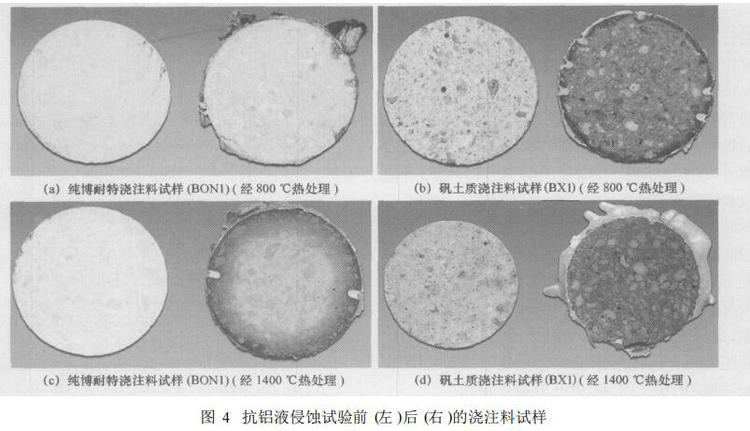 繼續升高溫度至 900 ℃,保溫120 h。待熔爐自然冷卻到700 ℃,打開坩堝,從熔融金屬中取出試樣。博耐特澆注料與兩種商品澆注料一起進行對比試驗。商品澆注料分別由鋁礬土、硅微粉和 BaSO4 (BX1)或者鋁礬土、活性氧化鋁和 BaSO4 (BX2 )組成。圖1( a) ~( d)顯示了試樣在抗鋁液侵蝕試驗前 (左邊試樣 )和后 (右邊試樣 )的情形。經過 800 ℃烘烤后純博耐特質澆注料,試驗后顯示不變色 (BON1) ; 試塊內部幾乎像試驗前那樣呈白色 ,見圖 4 ( a)。相反 ,試樣 BX1在相同的條件下預處理并且在加 BaSO4抗浸潤劑的情況下還出現變色。可以觀察到兩個滲透區:淺黑色的外環區域和試樣內部直至中心完全變為灰色的區域 ,見圖 4 ( b)。博耐特澆注料即使在 1400 ℃烘烤 ,抗鋁液侵蝕試驗后也只顯示些許變色 ,見圖 4 ( c) ,然而試樣 BX1顯示黑色 ,見圖 4 ( d)。試驗中觀察到的黃色硫化物氣體 ,說明抗浸潤劑在高溫下分解。