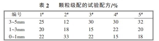 澆注料的致密程度和流動性跟顆粒級配密切相關,而最佳的顆粒級配又隨骨料種類、臨界粒度的大小和基質組成的不同而不同,最合適的顆粒級配應該由試驗確定。本試驗選擇了5 種不同的顆粒級配,細粉部分全部相同,顆粒級配的試驗配方如表2所示。