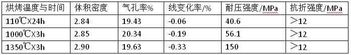 實驗中澆注料的粗粒(5~1.25mm)、中粒(1.25~0.065)mm、細(xì)粒(小于0.065mm)配比采用4:2:4,干混.0.5min,加水濕混5.5min后,測定自流值再在40mmX4mmX160mm三聯(lián)模中讓其自然流平,室溫下養(yǎng)護(hù)(12~18h),脫模后再養(yǎng)護(hù)24h,最后在烘箱中經(jīng)100℃X24h烘烤,測定其物理指標(biāo)。一組典型試樣指標(biāo)如表