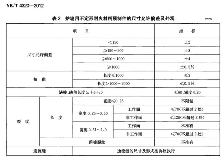 3.2 爐墻用不定形耐火材料預(yù)制件的尺寸允許偏差及外觀應(yīng)符合表2的規(guī)定,其形狀及尺寸按合同圖紙要求或由供需雙方協(xié)商。