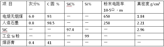 原料選用經(jīng)1750-2000℃的電煅燒無(wú)煙煤此時(shí)已經(jīng)半石墨化,石墨化呈度達(dá)15%~30%,它的結(jié)構(gòu)致密、強(qiáng)度高。因此,以其作為主要原料。為提高導(dǎo)熱系數(shù)、耐堿性,改善成型性,加入少量人造石墨。另外加入SiC,原因在于SiC比碳優(yōu)先氧化生成SiO。保護(hù)膜,覆蓋于表面,阻止制品進(jìn)一步氧化,可提高炭制品的抗氧化性。為提高材料的質(zhì)量,加入少量工業(yè)硅微粉,在焙燒成過(guò)程中,工業(yè)硅微粉與碳發(fā)生了Si(s)+C(s)→β-SiC(s)反應(yīng) ,生成物β-SiC,可賦予制品較高強(qiáng)度和耐磨性少量氣孔壁上未反應(yīng)的Si與氣孔中的氧、氮發(fā)生4Si(s)+ 2N2 (g)+ O2 (g)→2Si2ON2 (s)反應(yīng) Si2ON2 為針狀結(jié)晶,使氣孔變細(xì)或封閉、堵塞氣孔,降低制品透氣度,阻止渣、鐵的滲透,提高耐氧化性。各種原料的理化性能見(jiàn)表1。