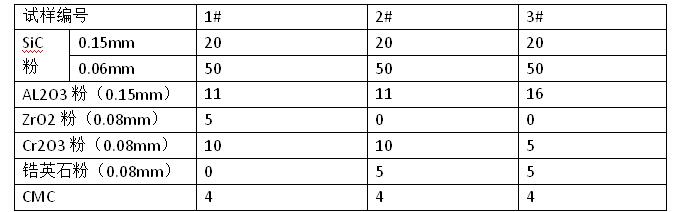 試驗碳化硅耐火材料則以SiC粉(工業純度SiC≥97%),AL2O3粉(工業純度AL2O3≥98%)為主要原料,并分別添加鋯英石粉(工業純度ZrO2≥65%)、ZrO2粉、Cr2O3、一級羥甲基纖維素(CMC)做結合劑配制成3種不同含量的成品料,配料成分表如下。