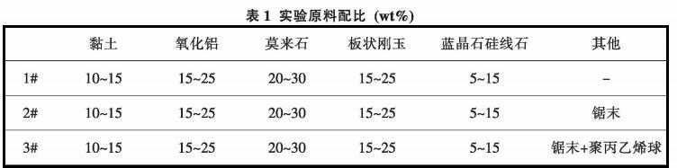 1.1原料,實驗主要原料如下:粘土、煅燒氧化鋁(Al203)99%,煅燒莫來石粉A1203>65%,板狀剛Al20399.4%、藍晶石和硅線石。實驗所用的泡沫劑為十二烷基磺酸鈉,所用的燃盡物為鋸末和聚丙乙烯球,結合劑為聚乙烯醇(PVA)