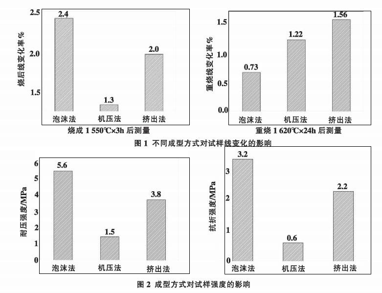 從圖1可以看出,莫來石質隔熱耐火磚試樣經1550℃燒成3h后,采用泡沫法制備的樣品線收縮率最大,達到2.4%;而采用擠壓法制備的樣品線收縮率最小,僅為1.3%。進一步將試樣在1620℃的溫度下重燒12h,采用泡沫法制備的樣品重燒線收縮率反而最小為0.73%;而采用擠出成型方式制備的樣品重燒線收縮率最大,達到了1.56%