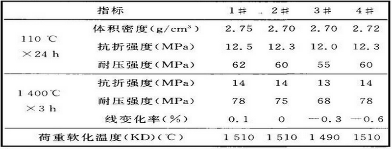 按照比例配好料經加水混合均勻后,倒入模具中振動成形為40mmX40mmX160mm試樣各6組,在室溫下養護24h后脫模,測試110℃X24h 處理后體積密度、抗折強度、耐壓強度和1400℃X3h處理后抗折強度、耐壓強度、荷重軟化溫度、燒后線變化率。實驗結果見表2