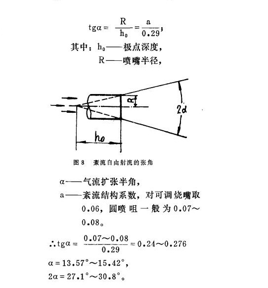 采用擴張型燒嘴磚作為延伸段具有使軸向和切向速度峰值之間徑向隔開距離加大,并使反向質量流量加大的綜合影響,所以平焰燒嘴磚推薦長度L=(1~2)d,其中d是噴管喉部直徑,氣流擴散角θ大于100°很容易向徑向展開,形成平展氣流,而半徑R=0.8~2.0D范圍內都能形成平焰。用中壓空氣做旋轉流體帶動直噴口噴出的低壓焦爐煤氣的平焰燃燒器,對喇叭口曲率半徑R=0.7~3.5D的14個燒嘴磚進行試驗,結果表明都能形成平面火焰。但當R=0.7D時較困難,它需要足夠大的旋流強度和火道深度。R=1.0~2.0D容易形成平焰,而R=1.1~1.5D時氣流附壁性最好,火焰直徑很大。R>2.0D時火焰直徑減小向燒嘴磚內移動,R=0即張角為180°時不能形成平面火焰。