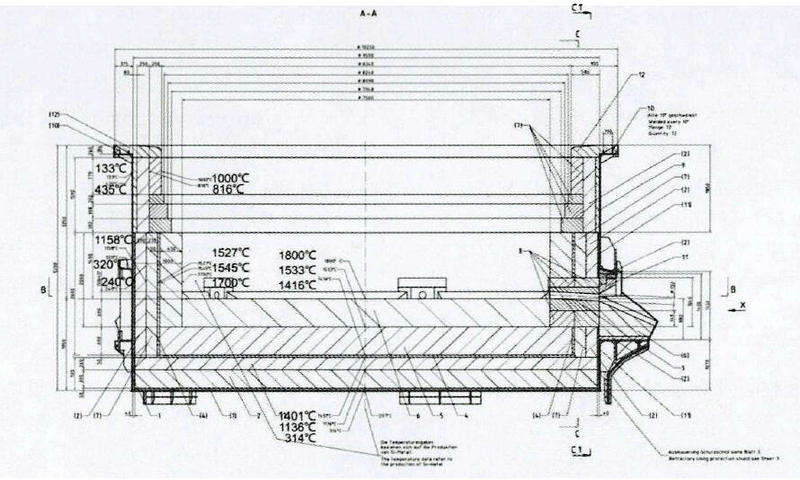 根據上圖,工業硅爐襯在正常生產時,其中心熔池反應溫度高達2000℃以上;爐底及爐墻側部炭磚溫度達到1800℃左右,經過熱傳導,傳遞到接觸碳素材料部位的耐火磚表面的溫度均達到了1550℃(如果爐膛參數設計不合理或超溫超負荷的情況下溫度會更高),傳統的爐襯材料設計為:爐墻從外到內分別為;絕緣石棉板、保溫層、高鋁磚、碳磚。傳統的爐襯材料配置里高鋁磚受高溫及熱力的條件下極容易變形軟化,導致熔池區域的碳素材料隨之變形拉開縫隙,最后導致高溫硅水從碳素材料縫隙漏出形成穿爐事故。