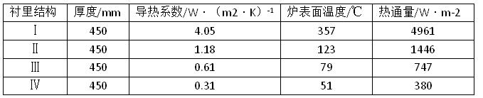 典型的軋鋼加熱爐爐襯厚度一般為400~500 mm,以爐墻內表面溫度為1250℃和爐襯厚度為450 mm為例計算,爐襯結構分別為:爐襯結構Ⅰ為全重質耐火澆注料;爐襯結構50 mm纖維板+400 mm澆注料的復合爐襯;爐襯結構Ⅲ為100 mm 纖維板+115 mm輕質粘土保溫磚+235 mm 澆注料的復合爐襯;爐襯Ⅳ為105 mm 纖維板+230 mm JM23 絕熱保溫磚+115 mm輕質莫來石耐火磚。