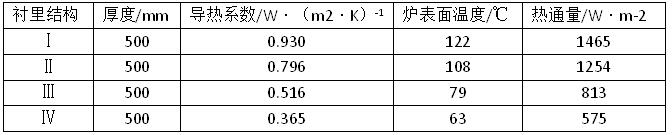 以爐墻內壁溫度為1600℃隧道窯為例,爐襯厚度500mm,爐襯耐火材料分別為氧化鎂磚、氧化鋁空心球磚、輕質粘土保溫磚、JM23 絕熱保溫磚、輕質莫來石磚、耐火纖維板。設計的1600℃隧道窯爐襯結構如下:爐襯結構Ⅰ為40mm 纖維板+230mm 輕質粘土保溫磚+230 mm 氧化鎂磚的復合爐襯;爐襯結構Ⅱ為40 mm纖維板+230 mm輕質粘土保溫磚+230mm氧化鋁空心球磚的復合爐襯;爐襯結構Ⅲ為40 mm纖維板+115 mm JM23絕熱保溫磚+115mm輕質莫來石磚+230mm氧化鋁空心球磚的復合爐襯;爐襯Ⅳ為采用110mm纖維板+115mmJM23絕熱保溫磚+115mm輕質莫來石磚+160mmAL2O3空心球磚的窯襯結構。爐墻外壁的對流輻射綜合傳熱系數和計算環境溫度數值同上