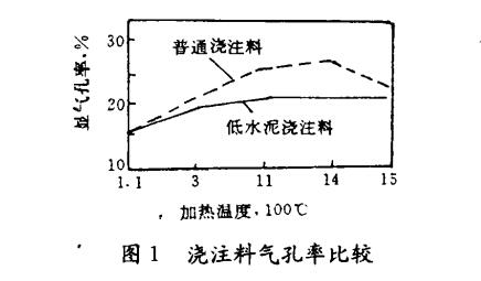 低溫時(shí)低水泥澆注料與普通澆注料的總孔隙相近。高溫加熱時(shí)低水泥澆注料變化不大,普通水泥澆注料總孔隙增加4%。如下圖1