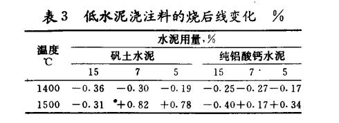 低水泥澆注料燒后線變化如表3.當(dāng)溫度在1400℃以下時(shí),低水泥澆注料的線變化為負(fù)值(收縮),但不太大。至1500℃時(shí)為正值(膨脹),其值為+0.1%~0.8%之間。這一特性體現(xiàn)了低水泥澆注料高溫體積穩(wěn)定性好,低水泥澆注料在加熱過程中,熱膨脹曲線為平緩且在整個(gè)過程區(qū)域內(nèi)不呈現(xiàn)收縮的特點(diǎn),這對(duì)于不定型耐火材料很重要的。