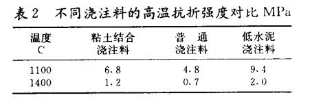 圖2為低水泥澆注料與普通澆注料、粘土澆注料強(qiáng)度變化的比較。可見,低水泥澆注料常溫強(qiáng)度較高,而中溫強(qiáng)度也不降低。表2表明了不同澆注料高溫?zé)釕B(tài)抗折強(qiáng)度的對(duì)比,可見低水泥澆注料的高溫抗折強(qiáng)度為普通澆注料的2~3倍,比粘土的也提高了許多。著說明低水泥澆注料兼有普通澆注料和粘土澆注料兩者的優(yōu)點(diǎn),它在各種溫度下都有高強(qiáng)度的特點(diǎn),這對(duì)于溫度高,出鋼頻繁,鋼錠和鉗吊經(jīng)常碰撞的場(chǎng)合,無疑是有好處的。