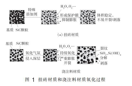 1表示了掛磚材質和澆注料材質在氧化侵蝕過程中的變化特征,由于澆注料材料致密度方面要低于掛磚,且碳化硅氧化過程中體積膨脹明顯,最終導致澆注料開裂,加速材料退化。對 于掛磚,廠內制磚過程中加入抗氧化的添加劑,同時調控燒磚氣氛,因此,掛磚材質體積穩定,不 易開裂/剝落,從而抗氧化能力遠高于澆注料,同時,致密度越高的材料抗氧化程度越強。