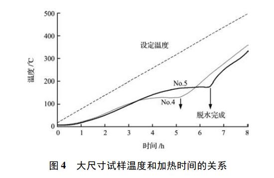 No5 試樣透氣率有所提高,為了比較,對 No4試樣進行了干燥試驗。所獲得的試樣內部溫度曲線示于圖4。對應設定溫度,No4 試樣和 No5 試樣幾乎都是按照相同的速度持續升溫,但是 No4 試樣在 130 ℃附近升溫速度放緩,推測最大蒸汽壓力大約是0.3 MPa。而No5試樣是在180 ℃放緩,推測蒸汽壓力大約是 1.0 MPa。另外從拐點位置算起,No4 試樣的脫水完成時間比 No5 試樣快 1.3 h 左右。由圖可知,No4 試樣尺寸大、透氣率高、內部 蒸汽壓力沒有提高,干燥結束時間也早。