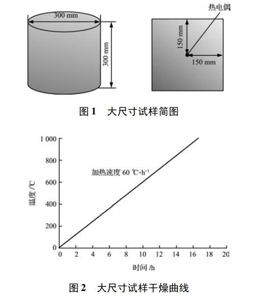 試樣的簡圖示于圖 1。圖 1 所示試樣的尺寸是Φ300 mm × 300 mm,熱電偶置于150 mm × 150 mm中心位置,混煉好的澆注料進行澆注,養生24 h。如圖2所示,脫模后以60 ℃ / h的速度加熱1000 ℃。根據所獲得的試樣內部溫度曲線對干燥特性進行了評價。