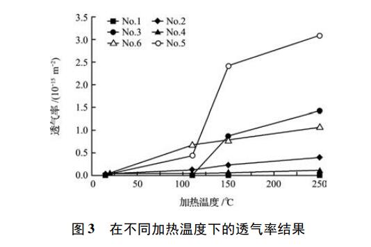 測定結果示于圖 3。根據這次測定的結果,從養生到250 ℃加熱處理,沒有加入添加劑的試樣幾乎沒有透氣性。為了提高養生體脫水時的透氣率,加入了特殊添加材料X 的 No2 試樣、No5 和 No6試樣在從養生到加熱250 ℃時透氣性有所提高。另外發現加入了有機纖維A的 No3 和 No5 試樣,在 150 ℃加熱時透氣率提高很大。加入了有機纖維 B的 No4 試樣和 No6 試樣,在 150 ℃ 和 250 ℃ 加熱時透氣率提高。并用特殊添加材料和有機纖維的No5 試樣和 No6 試樣,由于疊加效果的作用,透氣率大幅度提高。尤其是 No5 試樣,150 ℃加熱后透氣率顯著提高,特殊添加材料和有機纖維 A 并用特 別有利于形成連通氣孔。