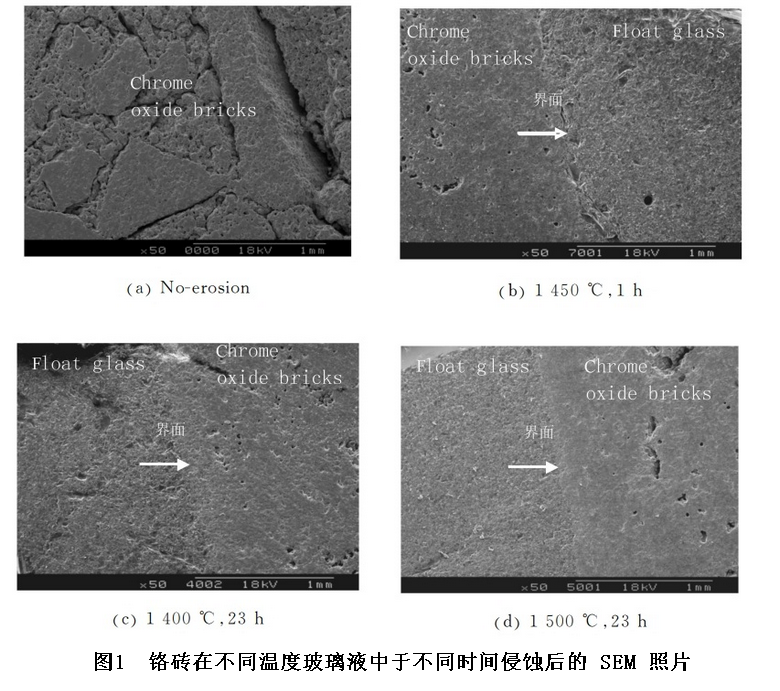 氧化鉻磚以下簡稱為鉻磚最早在有色冶金爐、煤氣渣化爐上使用,具有優良的抗爐外煉鋼渣、有色冶煉渣、煤氣化爐渣和各種玻璃液的侵蝕能力。這種耐火材料在玻璃熔窯上得到廣泛應用,但僅局限于深色瓶罐玻璃熔窯或無堿玻璃纖維熔窯,且主要用在玻璃熔窯的高溫部位,如上層池壁、小爐口、流液洞、加料口等處。由于它能顯著延長窯齡,因此引起了玻璃界的普遍關注.但是,由于鉻磚的價格比熔鑄鋯剛玉耐火材料的價格高出6倍多,所以,目前鉻磚的應用范圍還不廣泛,特別是在平板玻璃熔窯上的應用。本文主要講無色透明浮法玻璃液對鉻磚的侵蝕過程,重點討論了侵蝕速率與侵蝕溫度、侵蝕時間的相互關系。