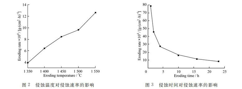 靜態條件下,侵蝕溫度是影響鉻磚耐玻璃液侵蝕性的主要因素.隨著侵蝕溫度升高,鉻磚受玻 璃液侵蝕的速率增加,其1500 ℃時所受侵蝕速率比1350 ℃時大一個數量級.鉻磚受玻璃液侵蝕 的速率隨著侵蝕時間延長而迅速減小,并趨于穩定。