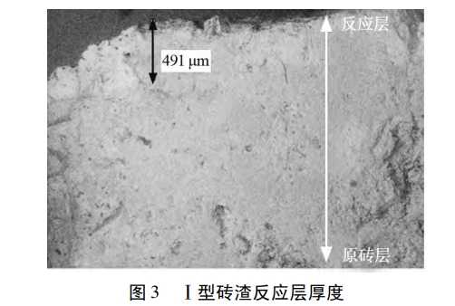 圖3為Ⅰ型 Al2O3-SiC-C 磚使用后磚渣反應層厚度。可見,拆解后的Ⅰ型Al2O3-SiC-C 磚反應層厚度很薄,說明反應產生的低熔物較多,磚面幾乎沒有保護層,導致低熔物不斷生成,連續被鐵水沖刷消耗,侵蝕速度大大增加。