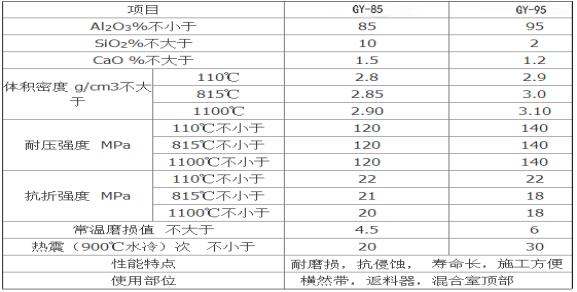 以剛玉為骨料和粉料外加一些結合劑所制備的耐火澆注料。具有比高鋁耐火澆注料和莫來石耐火澆注料更高的機械強度和抗磨蝕等性能,但抗熱震性能稍差些。主要用做鍋爐、高爐熱風爐、加熱爐、陶瓷窯爐等各種窯爐的內襯材料